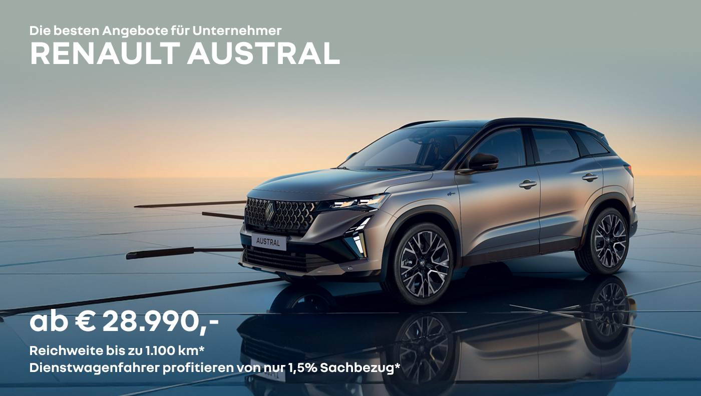 Unverb. Kaufpreis inkl. USt, NoVA und Boni iHv € 6.490,– gültig nur für Firmenkunden bei Kaufvertragsabschluss eines Renault Austral MY25 bei Kauf vom 01.03. bis 31.03.2026, zzgl. € 420,– brutto Auslieferpauschale. Aktionspreis beinhaltet Finanzierungsbonus iHv € 2.190,– von Mobilize Financial Services (eine Marke für RCI Banque SA Niederlassung Österreich) gültig nur in Kombination mit einem im Aktionszeitraum eingereichten und bei Auslieferung des ausgelobten Fahrzeugs abgeschlossenen Finanzierungsvertrages: Finanzierung-Mindestlaufzeit 24 Monate, Mindest-Finanzierungsbetrag 50 % vom Kaufpreis. *Bezieht sich auf den Full Hybrid E-Tech Antrieb mit vollem Kraftstofftank gemäß WLTP-Daten. Änderungen, Satz- und Druckfehler vorbehalten. Symbolfoto. Kombinierter Verbrauch von 6,3–4,6 l/100 km, CO2-Emission von 143–105 g/km, homologiert gemäß WLTP.