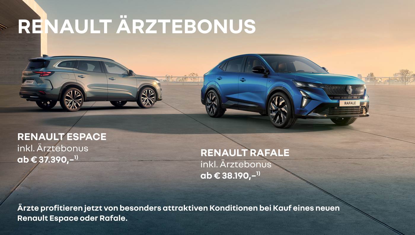 1) Unverb. Kaufpreis inkl. USt, NoVA und Boni iHv € 6.800,– (Rafale Techno Full Hybrid E-Tech 200) und € 6.700,- (Espace Techno Full Hybrid E-Tech 200 5-Sitzer) zzgl. max. € 420,- Auslieferungspauschale exkl. NoVA, für Ärzte auf ausgewählte Modelle bei Kaufvertragsabschluss vom 01.01. bis 31.03.2026. Kaufpreis beinhaltet Finanzierungsbonus iHv € 1.814,-(Rafale) und € 1.778,- (Espace) von Mobilize Financial Services (eine Marke für RCI Banque SA Niederlassung Österreich), gültig nur in Kombination mit einem im Aktionszeitraum eingereichten und bei Auslieferung des ausgelobten Fahrzeugs abgeschlossenen Finanzierungsvertrages: Finanzierung-Mindestlaufzeit 24 Monate, Mindest-Finanzierungsbetrag 50 % vom Kaufpreis. Angebot gilt ausschließlich für Ärzte, die zum Zeitpunkt der Bestellung (Kaufantrag) bei der österreichischen Ärztekammer gelistet sind (www.aerztekammer.at). Stand 01/2026. Ausgenommen sind Großabnehmerkunden mit Sonderkonditionen. Keine Barablöse möglich. Änderungen, Satz- und Druckfehler vorbehalten. Symbolfoto. Kombinierter Verbrauch Renault Espace/Rafale von 4,9–1,7 l/100 km, CO2-Emission von 110–40 g/km, homologiert gemäß WLTP.