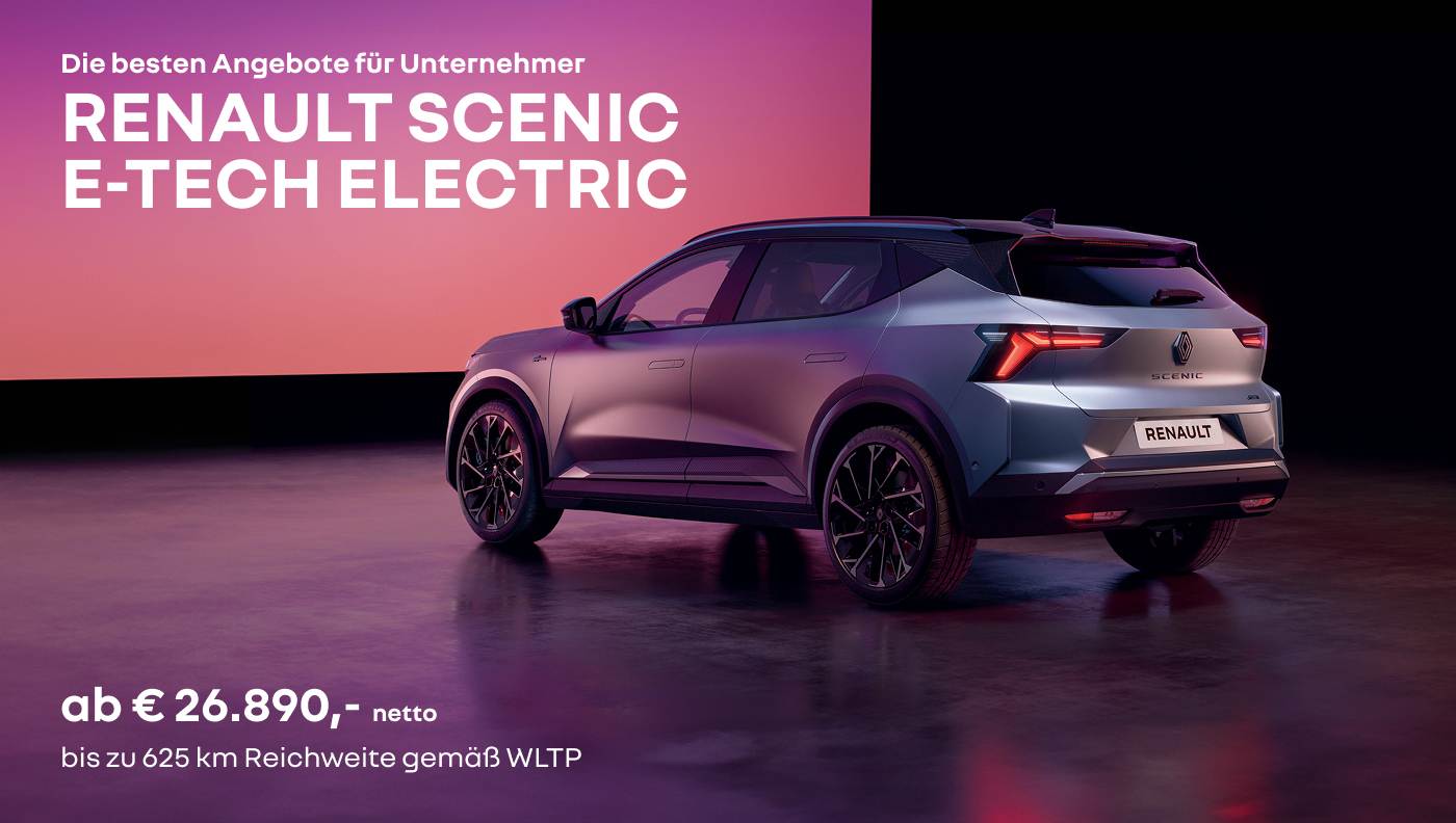 Unverb. Kaufpreis inkl. USt, NoVA und Boni iHv € 7.294,– (Scenic E-Tech Electric Evolution 170 PS comfort range) gültig nur für Firmenkunden bei Kaufvertragsabschluss vom 01.01. bis 31.03.2026, exkl. USt, zzgl. max. € 350,– netto Auslieferpauschale. Aktionspreis beinhaltet Finanzierungsbonus iHv € 2.055,– von Mobilize Financial Services (eine Marke für RCI Banque SA Niederlassung Österreich) gültig nur in Kombination mit einem im Aktionszeitraum eingereichten und bei Auslieferung des ausgelobten Fahrzeugs abgeschlossenen Finanzierungsvertrages: Finanzierung-Mindestlaufzeit 24 Monate, Mindest-Finanzierungsbetrag 50 % vom Kaufpreis. Änderungen, Satz- und Druckfehler vorbehalten. Symbolfoto. Stromverbrauch von 16,8 – 16,3 kWh / 100 km , homologiert gemäß WLTP.