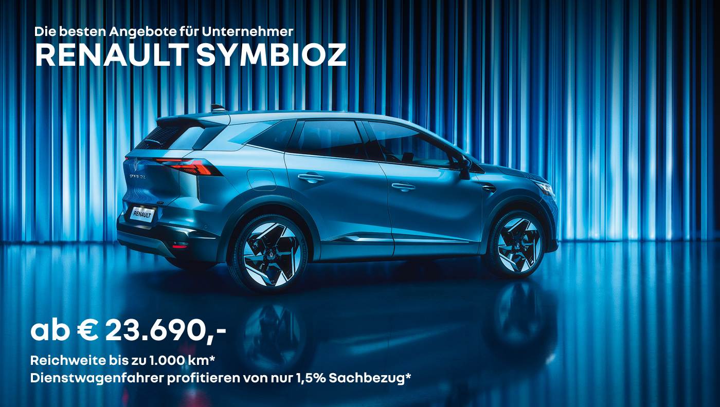 Unverb. Kaufpreis inkl. USt, NoVA und Boni iHv € 6.020,– gültig nur für Firmenkunden bei Kaufvertragsabschluss eines Renault Symbioz MY25 bei Kauf vom 01.03. bis 31.03.2026, zzgl. € 420,– brutto Auslieferpauschale. Aktionspreis beinhaltet Finanzierungsbonus iHv € 1.801,– von Mobilize Financial Services (eine Marke für RCI Banque SA Niederlassung Österreich) gültig nur in Kombination mit einem im Aktionszeitraum eingereichten und bei Auslieferung des ausgelobten Fahrzeugs abgeschlossenen Finanzierungsvertrages: Finanzierung-Mindestlaufzeit 24 Monate, Mindest-Finanzierungsbetrag 50 % vom Kaufpreis. *Bezieht sich auf den Full Hybrid E-Tech Antrieb mit vollem Kraftstofftank gemäß WLTP-Daten. Änderungen, Satz- und Druckfehler vorbehalten. Symbolfoto. Kombinierter Verbrauch von 5,9– 4,3 l/100 km, CO2-Emission von 133 – 98 g/km, homologiert gemäß WLTP.