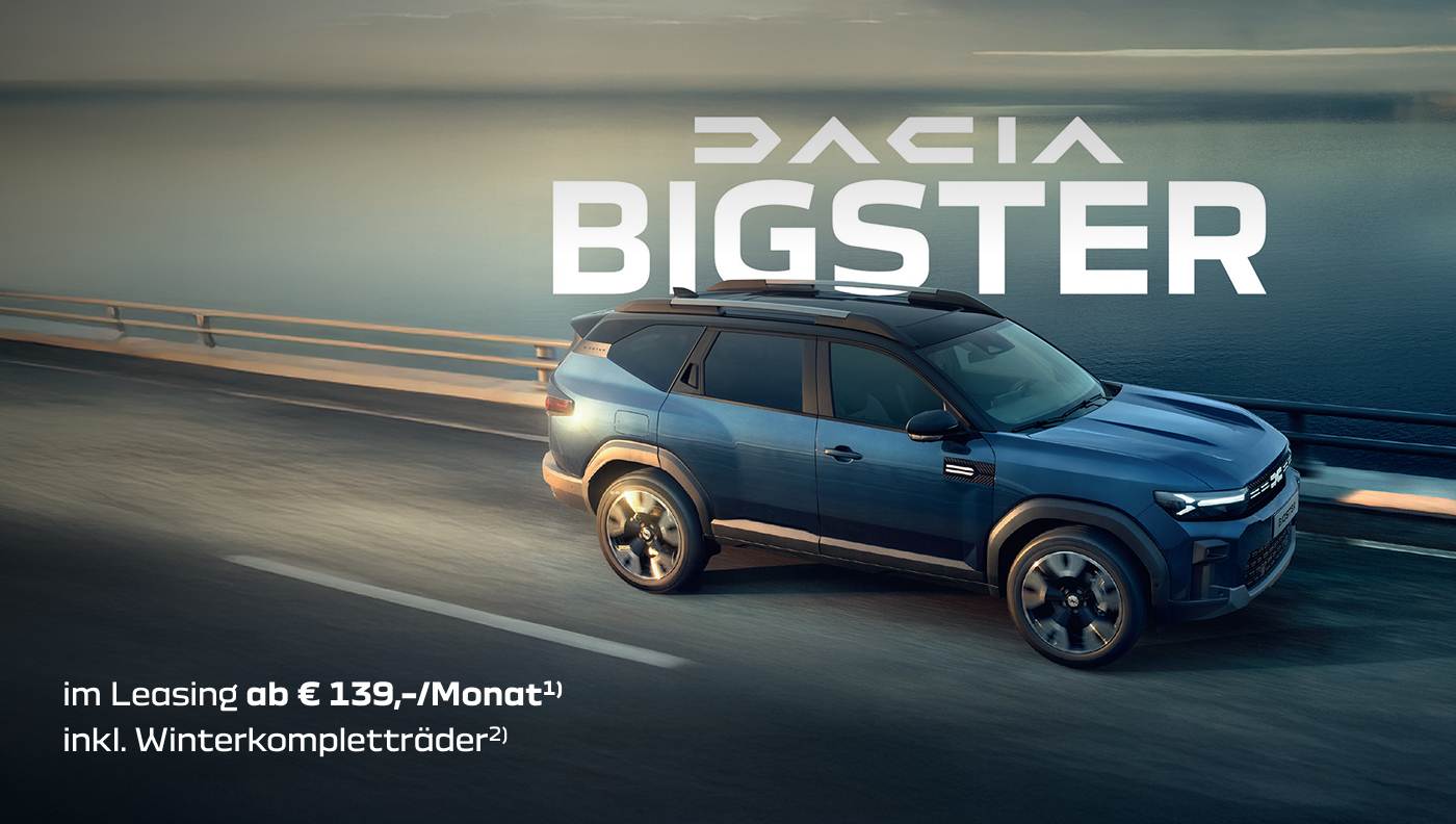 1) Angebot von Mobilize Financial Services (eine Marke für RCI Banque SA Niederlassung Österreich), gültig für Privatkunden bis 31.03.2026 bei allen teilnehmenden Dacia Partnern. Berechnungsbeispiel: Bigster Expression Mild Hybrid 140, monatliche Rate: € 139,-, Barzahlungspreis exkl. Auslieferungspauschale € 24.790,-, Gesamtleasingbetrag € 17.656,-, Laufzeit 36 Monate, Kilometerleistung 10.000 km p.a., Anzahlung € 7.162,-, Restwert € 15.060,-, Bearbeitungsgebühr € 0,-, Vertragsgebühr € 122,-, fixer Sollzinssatz 4,99%, effektiver Jahreszins 5,2%, Gesamtbetrag € 20.186,-. 2) Mit Leichtmetallfelgen bei Leasing gilt für Privatkunden bei Kaufvertragsabschluss des ausgelobten Dacia Modells von 01.01. bis 31.03.2026. Gültig nur in Kombination mit einem im Aktionszeitraum eingereichten und bei Auslieferung des ausgelobten Fahrzeugs abgeschlossenen Leasingvertrages bei Mobilize Financial Services. Solange der Vorrat reicht. Gültig mit ausgefülltem Lead-Formular auf www.dacia.at oder direkt im Händler-Schauraum. Keine Barablöse möglich. Änderungen, Satz- und Druckfehler vorbehalten. Symbolfoto.