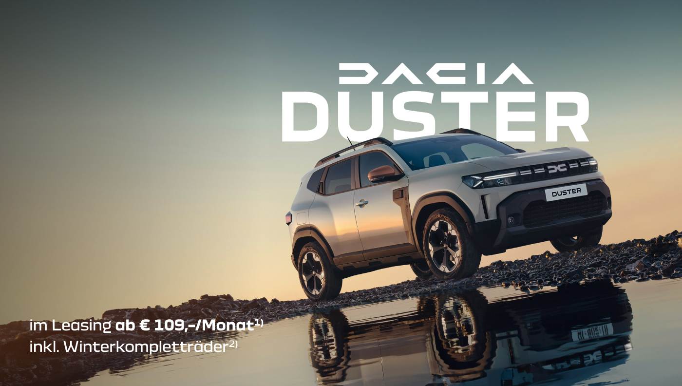 1) Angebot von Mobilize Financial Services (eine Marke für RCI Banque SA Niederlassung Österreich), gültig für Privatkunden bis 31.03.2026 bei allen teilnehmenden Dacia Partnern. Berechnungsbeispiel: Duster Expression Mild Hybrid 140, monatliche Rate: € 109,-, Barzahlungspreis exkl. Auslieferungspauschale € 21.490,-, Gesamtleasingbetrag € 15.087,-, Laufzeit 36 Monate, Kilometerleistung 10.000 km p.a., Anzahlung € 6.426,-, Restwert € 13.250,-, Bearbeitungsgebühr € 0,-, Vertragsgebühr € 104,-, fixer Sollzinssatz 4,99%, effektiver Jahreszins 5,2%, Gesamtbetrag € 17.277,-. 2) Mit Stahlfelgen exkl. Radzierkappen bei Leasing gilt für Privatkunden bei Kaufvertragsabschluss des ausgelobten Dacia Modells von 01.01. bis 31.03.2026. Gültig nur in Kombination mit einem im Aktionszeitraum eingereichten und bei Auslieferung des ausgelobten Fahrzeugs abgeschlossenen Leasingvertrages bei Mobilize Financial Services. Solange der Vorrat reicht. Gültig mit ausgefülltem Lead-Formular auf www.dacia. at oder direkt im Händler-Schauraum. Keine Barablöse möglich. Änderungen, Satz- und Druckfehler vorbehalten. Symbolfoto.